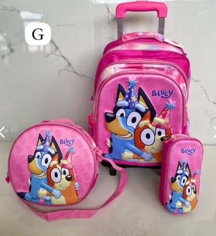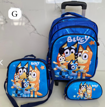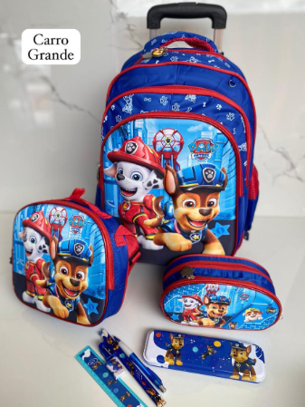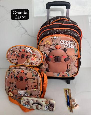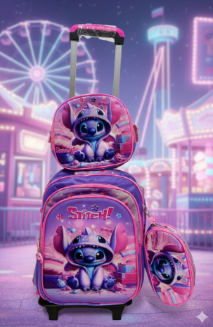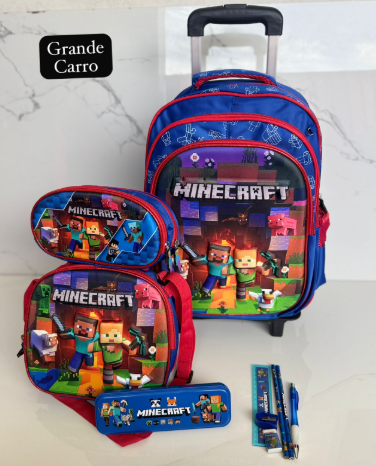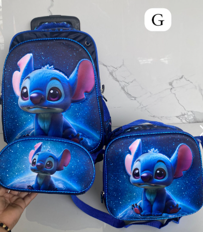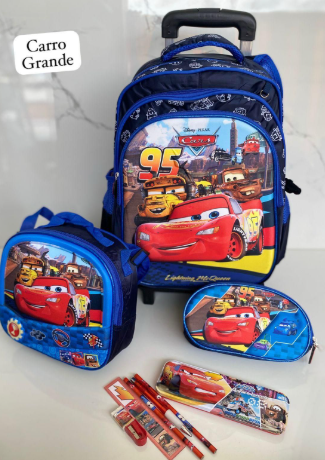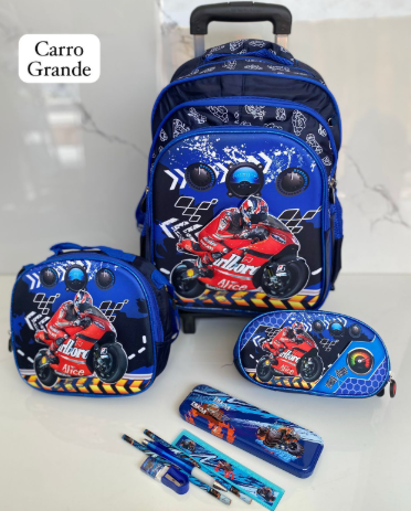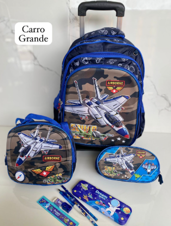 Es un kit completo de 3 piezas: Maleta de ruedas de tamaño grande (oficio), lonchera térmica y cartuchera a juego. La maleta principal tiene el espacio ideal para todos los cuadernos grandes, carpetas y libros de la lista escolar sin que se doblen.